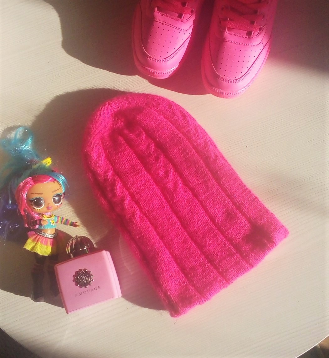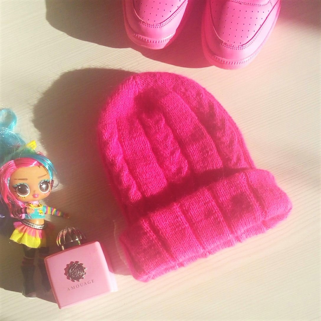Я вязала из пряжи «Пух норки» оттенок № 875 светящийся розовый в одну основную и две дополнительные нити на спицах № 2,5 резинкой 8 на 2. Расход на шапку 1,5 мотка основной нити и 2 мотка дополнительной нити.