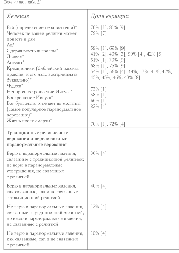 Сократ. Апология 38аЗачем изучать миры паранормального? Если вы верите в подобные вещи, то вы не одиноки. Большинство людей (73–76 %) верят хотя бы одному сообщению о паранормальном явлении, не имеющему отношения к иудео-христианской традиции (Moore, 2005; Newport & Strausberg, 2001), а 80–96 % придерживаются веры в паранормальное, связанное с религией (Bader, Froese, Johnson, Mencken, & Stark, 2005). Сегодня в астрологию верит больше людей, чем в Средние века (Gilovich, 1991; Vyse, 1997), да и вера в дьявола, судя по всему, за последнее десятилетие заметно выросла (табл. 2.1). Важно по меньшей мере понять, во что верят наши друзья, соседи, политики, врачи и проповедники.