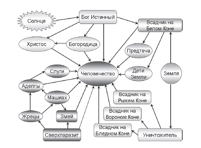 2.3.2 Состав и диспозиция основных действующих силСостав основных «богоподобных» сил был осознан еще в 2008 году, когда утверждаемые религией образы удалось сопоставить с их информационной природой и материальными носителями. В работе «Бесконфликтная технология выживания человечества в условиях ресурсного голода (Свидетельство Белого Всадника)» было показано, что в предстоящих трагических событиях на человечество в наибольшей мере будут влиять три интегральных информационных существа: Бог Истинный, Уничтожитель и Сверхпаразит (Курочкин, 2009).
