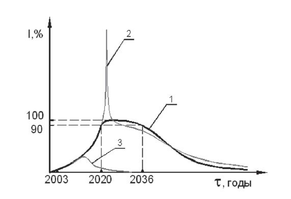 Первоначально открытые военные столкновения будут происходить на приграничных территориях малых стран, а впоследствии и на территориях самих противостоящих сил. Со стороны коалиции Сверхпаразита будут предприняты обнаруживаемые уже сейчас усилия по разделению противоборствующей стороны для последовательного уничтожения сначала Ирана, потом России, затем Китая и, в последнюю очередь, Индии. В определенной степени эти усилия увенчаются успехом, и, в результате, общемировая война в течение довольно длительного времени будет идти с пологим максимумом интенсивности. Исторические пределы общемировой войны были осознанны заблаговременно. В частности, в работе «Бесконфликтная технология выживания человечества в условиях ресурсного голода (Свидетельство Белого Всадника)» (Курочкин, 2009) был опубликован априорный прогноз ее интенсивности, показанный на рисунке 1.