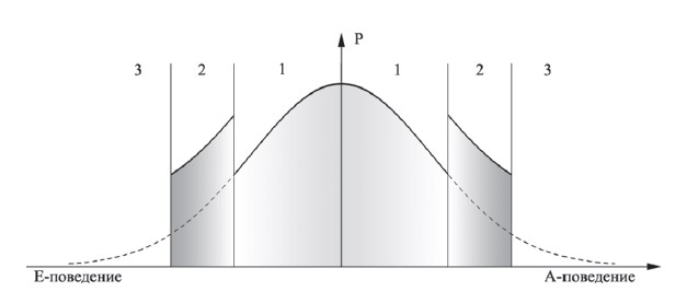 Рис. 2. Вероятность выживания (Р) индивида в зависимости от преобладания эгоистических (E-поведение) или альтруистических (A-поведение) стратегий его поведения в социуме:
