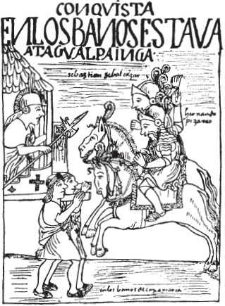 Атауальпа был удивлен, не видя вокруг испанцев. Позже он признался, что подумал, будто они все в страхе попрятались при виде его великолепной армии. «Он позвал: «Где же они?» Тогда из здания, в котором скрывался губернатор Писарро, появился монах-доминиканец Висенте де Вальверде в сопровождении переводчика Мартина». «Он шел с крестом в одной руке и молитвенником в другой мимо отрядов воинов и остановился перед паланкином Атауальпы».