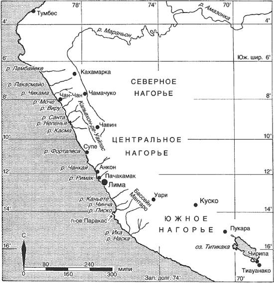 В мире не много областей и регионов, где столь короткая поездка преподносит путешественнику такие изменения в климате и топографии, как на территории Перу. На западе это прибрежная равнина, одна из великих пустынь мира, где на мили тянутся опаляемые солнцем камни и дюны в форме полумесяца. Жизнь была бы здесь невозможна, если бы не речные долины, пересекающие ее с востока на запад, где древние народы, по сравнению с их преемниками до весьма недавних времен, орошали большую по размерам территорию. Для путешественника, который летит над побережьем, эти долины кажутся последовательностью узких зеленых полосок среди больших пространств желтого и коричневого цвета; они весьма различны по размеру, хотя самые большие из них преимущественно находятся на севере.