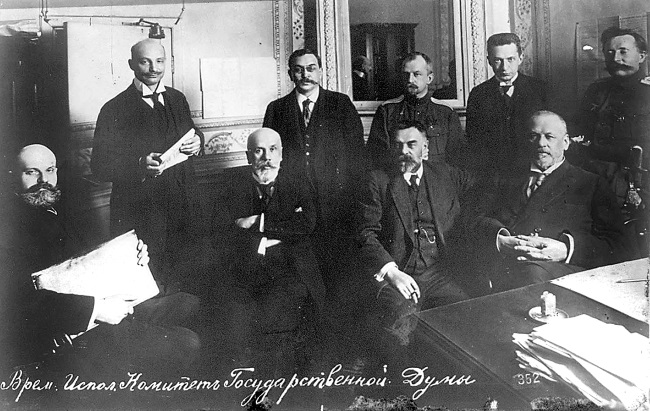 Члены Временного комитета Государственной думы. Сидят (слева направо): В.Н. Львов, В.А. Ржевский, С.И. Шидловский, М.В. Родзянко. Стоят: В.В. Шульгин, И.И. Дмитрюков, Б.А. Энгельгардт (комендант Петроградского гарнизона), А.Ф. Керенский, М.А. Кар