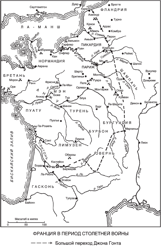 Не стоит утомлять читателей подробными описаниями многочисленных осад обеими сторонами крепостей в последующие восемь лет, когда французы медленно приближались к Бордо. Нет нужды и в обстоятельном рассказе о передвижениях различных английских армий по французской территории. Таких передвижений было не менее пяти. Первый переход совершил в 1369 году Джон Гонт, который высадился в Кале и совершил марши в Арфлер и обратно, не вступая в соприкосновение с противником. Второй переход осуществлялся в 1370 году под командованием бывшего простолюдина, сэра Роберта Ноулза. Он тоже высадился в Кале, совершил марш через Аррас в Труа и затем, минуя Париж, направился в Бретань. К сожалению, во время этого перехода он поссорился с представителями знати, которые увели свои войска в другом направлении. Дюгеклен воспользовался этим распылением сил для нападений на изолированные воинские колонны англичан и их уничтожения. Третья военная кампания получила название «великий поход Джона Гонта» и заслуживает более обстоятельного обсуждения, поскольку привлекла внимание всего цивилизованного мира того времени и действительно напоминает эпопею Христофора Колумба. Гонт располагал войском численностью 15 тысяч солдат, ему было поручено освободить Гасконь. К этому времени французы господствовали на море, и добраться до провинции морем не представлялось возможным. Поэтому Гонт высадился в Кале, заявив, что совершит марш через среднюю часть Франции в Бордо. По карте это был маршрут протяженностью почти 600 миль по территории враждебной страны. Французы повсюду уклонялись от боя с ним, и самым опасным врагом английского военачальника стал голод. С приближением зимы англичане вышли на возвышенности Центральной Франции. Обстановка все больше ухудшалась, но Гонт противостоял трудностям с железной решимостью своего отца Эдуарда III. Он продолжал двигаться через горы и наконец спустился в долину реки Дордонь. К Рождеству, почти через пять месяцев после выступления в поход, Гонт прибыл в Бордо, преодолев около тысячи миль. При нем осталось чуть больше половины армии, остальная часть погибла в пути.