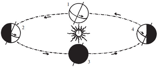 Позиция 1 соответствует весеннему равноденствию, которое бывает 21 марта, когда ночь по продолжительности равна дню. 21 июня, в день летнего солнцестояния, – позиция 2 – к Солнцу обращено все Северное полушарие, где в этот сезон устанавливаются самые длинные дни. В день осеннего равноденствия 23 сентября – позиция 3 – ночь и день снова имеют одинаковую продолжительность. Позиция 4 соответствует дню зимнего солнцестояния, самому короткому дню в году, который наступает 21 декабря, а Северное полушарие наклонено в противоположную сторону от Солнца и, следовательно, тепла.
