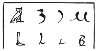 Установив это, Шампольон вернулся к изучению картушей Розеттского камня. В 1822 году он получил копии двух недавно обнаруженных картушей, выгравированных на небольшом обелиске, найденном на острове Филе. На основании обелиска находилась надпись на греческом языке, посвященная Птолемею и Клеопатре. Шампольон показал, что один из картушей с обелиска похож на картуш Розеттского камня, в нем содержалось имя Птолмис. Второй картуш, новый, содержал имя Клиопатра[12]. Пять букв встречаются в обоих именах: п, т, л, о, и. Пять одинаковых знаков обнаружено в нужных местах в двух именах, написанных иероглифами. С другой стороны, буква «с» из имени Птолмис не появляется в имени царицы, а знаки, соответствующие буквам «к», «а» и «р» в имени Клеопатры, не содержатся, да и не должны содержаться в имени царя (рис. 3). Вывод был таковым: поскольку одинаковые знаки в двух именах выражают одинаковые же звуки в каждом картуше, они исключительно фонетические.