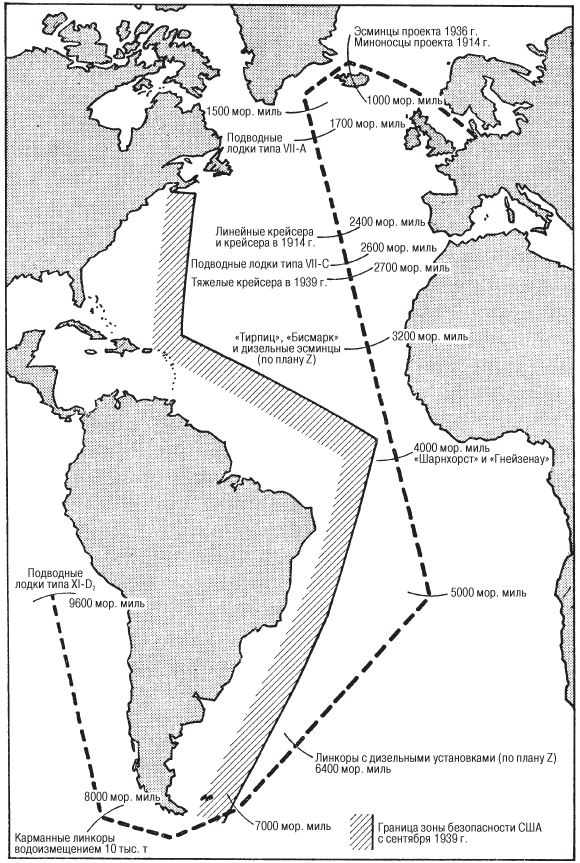 Радиус действия некоторых классов боевых кораблей Германии (учитывается переход в район боевых действий и обратно, с сохранением 20 % запаса топлива для боя). Подводные лодки проходили к югу от Исландии. Захват французских портов в Бискайском заливе позволил увеличить радиус действия судов.