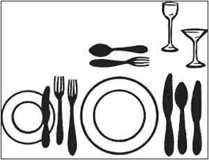 Справа обычно лежат ножи, обращенные лезвием к тарелке; слева – вилки, обращенные зубцами вверх. Суповая ложка кладется справа от внешнего ножа, а если десерта нет, то перед тарелкой. Если перед супом есть еще закуска, то соответствующий прибор, средний по размеру, кладется по краям уже положенных на стол приборов: нож – справа от суповой ложки, а соответствующая вилка – слева от тарелки с самого края. За суповой ложкой кладут, если необходимо, рыбный прибор, а непосредственно у тарелки – большой прибор для мясного блюда.