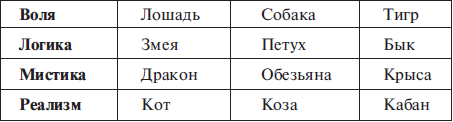 Воля (Лошадь, Собака, Тигр). Воля – это не мелкая черта характера, это идеология, магистральная линия поведения. Перечисленные три знака – это собранная в кулак власть мира. Все остальные живут без реального плана, качаются на волнах жизни и неизбежно подчиняются чужой воле, и лишь эти трое остаются хозяевами своей и чужой судьбы. Только им троим не лень связывать воедино реальность и логические схемы, только они пытаются соединить одной траекторией прошлое и будущее, поставив в центр полученной оси настоящее.