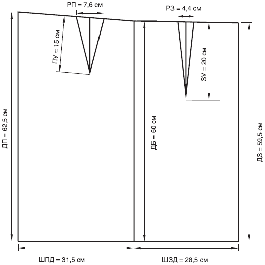 Три минуты на расчеты, и у нас готовы растворы вытачек: S = (103 – 77) : 2 = 13 см.
