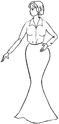 Перед нами дама (см. рисунок) с разной крутизной бедер слева и справа и разной выпукл остью живота – Ксения. Уже на этапе снятия мерок работы у вас прибавится. Необходимо отдельно промерить левую и правую части тела, внимательно снимая значения иксов и игреков. Возможно, различными окажутся измерения длин по левому и правому боку.
