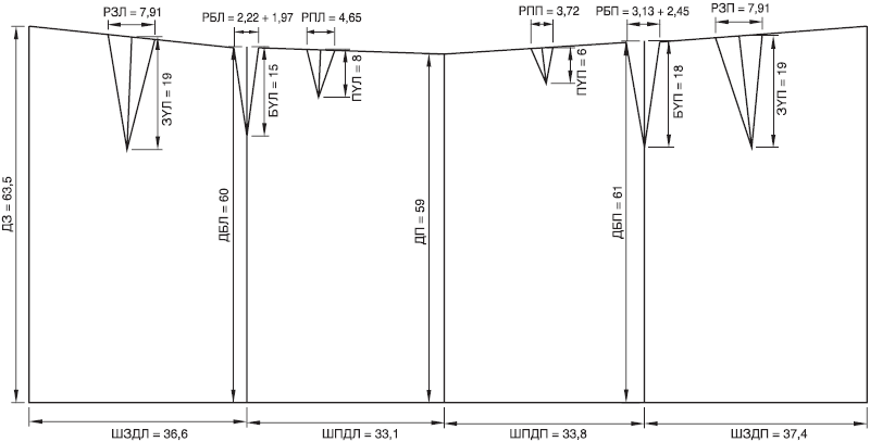 Следовательно, распределение боковой вытачки следующее: 1,975 см убирают с переднего полотнища, а с заднего РБЛ – 1,975 = 2,22 см.