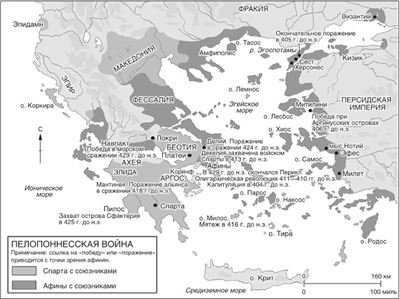 Она длилась с перерывами 27 лет, до 404 года до н. э. По сути, то была война сухопутных греков против греков морских. На одной стороне выступала Спартанская лига с Беотией, Македонией (ненадежный союзник) и Коринфом как самыми важными сторонниками Спарты; они удерживали Пелопоннес и пояс суши, отделявший Афины от остальной территории Греции. Союзники Афин располагались вдоль побережья Эгейского моря, в ионийских городах и на островах, то есть в области, принадлежавшей им со времен Делосского союза. Стратегия диктовалась доступными средствами. Армию Спарты было лучше всего использовать для захвата афинской территории с последующим ее подчинением. Афинянам было нечего противопоставить своим врагам на суше. Зато они располагали более мощным флотом. Он считается в значительной мере творением двух великих афинских государственных деятелей и патриотов – Фемистокла и Перикла, которые полагали, что великий флот позволит их городу отразить любое нападение. События развивались совсем по иному сценарию, к тому же в городе вспыхнула эпидемия чумы, а после смерти Перикла в 429 году до н. э. афиняне лишились достойного командования, но фактическая бесполезность первых десяти лет войны вытекает из данного стратегического тупика. В 421 году до н. э. пришлось заключить мир, продлившийся совсем недолго. Огорчения афинян в конце концов нашли выход в замысле по переносу военных действий вглубь суши.