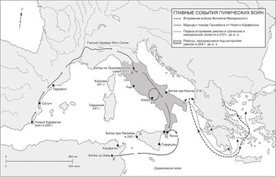 Так закончился всего лишь первый тур. Конец III века до н. э. приближался, а окончательного результата все еще не просматривалось, зато напрашивается масса предположений по поводу того, какая из сторон в этой опасной ситуации несет ответственность за развязывание Второй Пунической войны (218–201 гг. до н. э.), ставшей величайшей из трех. Война разворачивалась на огромном по протяженности театре вооруженного противоборства, ведь когда она начиналась, карфагеняне уже обосновались в Испании. Некоторым тамошним греческим городам римляне обещали покровительство. Когда один из них подвергся осаде с последующим разрушением карфагенским войском во главе с полководцем Ганнибалом, война как раз и началась. Она получила широкую известность благодаря протяженному переходу Ганнибала в Италию и преодолению его войском Альп вместе со слонами, а также своей кульминации в виде сокрушительных карфагенских побед у Тразименского озера в 217 году до н. э. и при Каннах в 216 году, где погибла римская армия, в два раза превосходившая численностью ратников войска Ганнибала. В этот момент хватка Рима, которой он держал Италию, серьезно ослабла; некоторые его союзники и вассалы начали приглядываться к карфагенской мощи как символу лучшего будущего. Фактически весь юг перешел в войне на противоположную сторону, только Центральная Италия осталась преданной Риму.