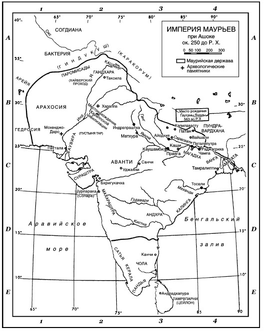 274–232. Правление Ашоки (внука Чандрагупты). Он привел империю Маурьев к пику ее величия. Ашока вел борьбу с несколькими претендентами на престол, но, придя к власти, предпринял только одну кампанию, завоевав царство Калинга – восточное побережье Индии между Гангом и Деканским плоскогорьем. Под влиянием кровавой бойни в ходе военных действий он зарекся от войн и стал буддистом. Его огромная империя включала почти всю Индию, Непал и значительную часть Афганистана. Многие историки считают его величайшим правителем Индии.