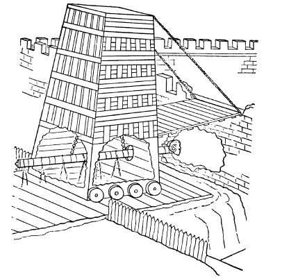 Основным осадным орудием по-прежнему оставался таран, применявшийся для разрушения крепостных стен, башен и ворот. Таран представлял собой бревно с железным либо бронзовым наконечником, подвешенное на цепях или на канатах в деревянной башне в несколько этажей, которая передвигалась на колесах и служила прикрытием для обслуживавших таран людей.