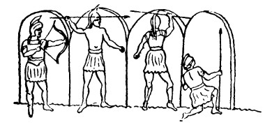 Как правило, лучники щитов не носят: их прикрывают щиты идущих перед ними метателей дротиков. Хотя ближнего боя по возможности избегают, и лучники, и метатели дротиков вооружены достаточно длинными мечами с широким лезвием. Если решить исход боя огнем с дальней позиции не удается, в ход идут клинки.