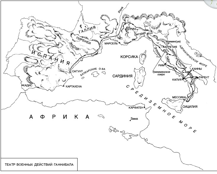 218. План Ганнибала. Стремясь лишить Рим преимущества, которое обеспечивал ему контроль над морями, Ганнибал планирует провести крупное войско по суше через Испанию, Южную Галлию, перевалить через Альпы и занять долину реки По. Еще ранее он завязывает отношения с союзниками в Трансальпийской и Цизальпинской Галлии, таким образом приобретая надежное сообщение с Испанией и мощную базу для наступления в Северной Италии. Он начал переговоры с македонским царем Филиппом V, намереваясь втянуть Рим в войну на два фронта. Для удержания Испании Ганнибал оставляет 20-тысячное войско под командованием Гасдрубала.