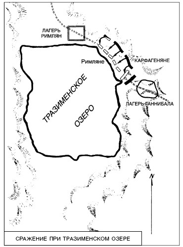 Гай Фламиний слишком поздно понял, что его коммуникации перерезаны. Он направляется на юг с целью дать сражение Ганнибалу, принося безопасность в жертву скорости. Ганнибал устраивает засаду у озера и разбивает наголову войска Фламиния (31 тыс. воинов), совершавшие марш без разведки и охранения.