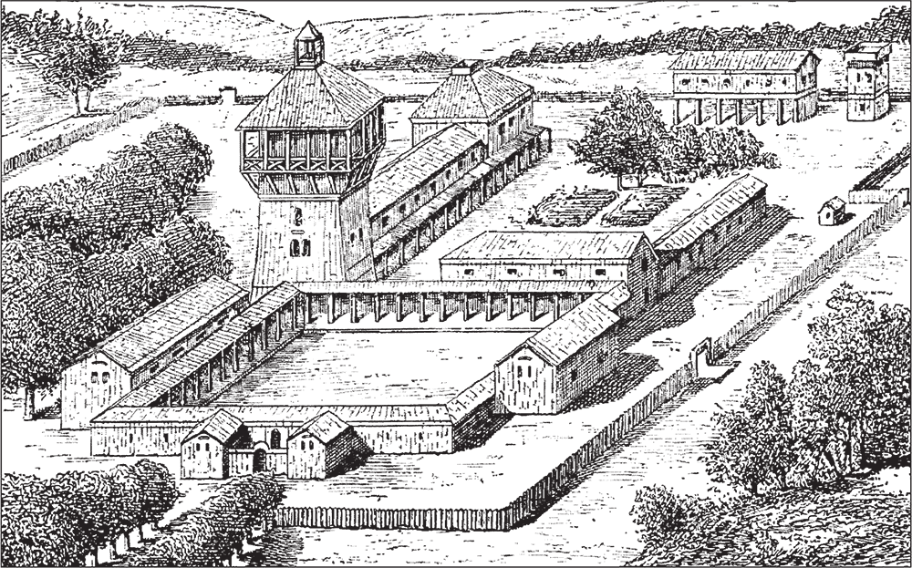 Восстановлена. Обратите внимание на большой двор, окруженный жилыми комнатами и портиком. Усадьба окружена забором, а в центре возвышается деревянная башня для обороны от врагов. На заднем плане – хозяйственные постройки. (Воспроизведено по книге. Гарнье и Амман. История человеческих жилищ.)