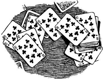 So the Willing Warlock handed over all his £273 6s 4d. Then he was allowed to pick a card. It was the ten of clubs. Not a bad card, the Willing Warlock thought. He was no Fortune Teller, of course, but he knew the ten of clubs meant that someone would bully somebody. He decided that he would be the one doing the bullying, and handed back the card. Jean-Pierre tossed all the cards carelessly down on a table. The Willing Warlock just had time to see that every single one was the ten of clubs, before he found himself still in Shepherd’s Bush, but in another world entirely.