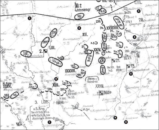«Положение противника. Перед фронтом армии основные группировки противника (мотопехота и танки) сосредоточены в районах Почеп, Мглин, Унеча и до моторизованного полка с танками в районе Стародуба. Его развед. части действуют на всем фронте армии.
