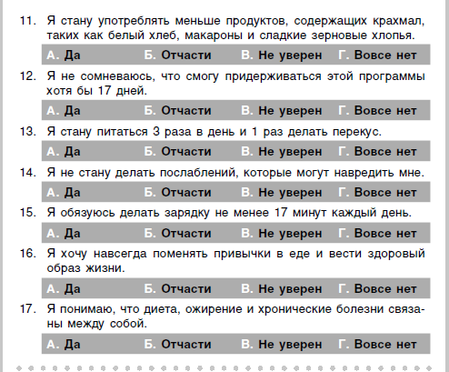 Пройдите этот тест, чтобы понять, готовы ли вы пройти курс семнадцатидневной диеты. Успешная и здоровая потеря лишнего веса требует правильного образа мышления. Выберите ответ, который, на ваш взгляд, лучше всего отражает ваше мнение.