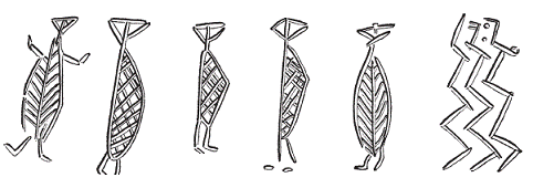 Иногда появляющиеся на рисунках человеческие фигуры могут быть изображениями самих шаманов или духов, с которыми они вступали в контакт, принимающих форму не только животных, но и людей. Подобные рисунки редко оказываются реалистичными, хотя столь умелые художники, судя по группе людей, выцарапанной на кости первобытного быка, найденной в Рюемарк-горде (Зеландия) и датированной периодом мезолита, вполне могли изображать человеческие фигуры. Я думаю, что необоснованно причислять изображенных на этих рисунках существ к миру людей, скорее, они являются духами, а фигура танцующего человека, нарисованная справа, должно быть, представляет собой изображение шамана. Другой рисунок, на котором, судя по всему, изображен шаман в трансе, был найден на куске оленьего рога, найденного в болоте Юрдлёсе (Дания). В Норвегии были обнаружены изображения обнаженных людей с капюшонами, а на обрыве в Рёдёе был найден рисунок, на котором изображен мужчина в рогатом головном уборе, стоящий на лыжах. Это вполне могло быть изображение шамана, отправившегося в сверхъестественное путешествие.