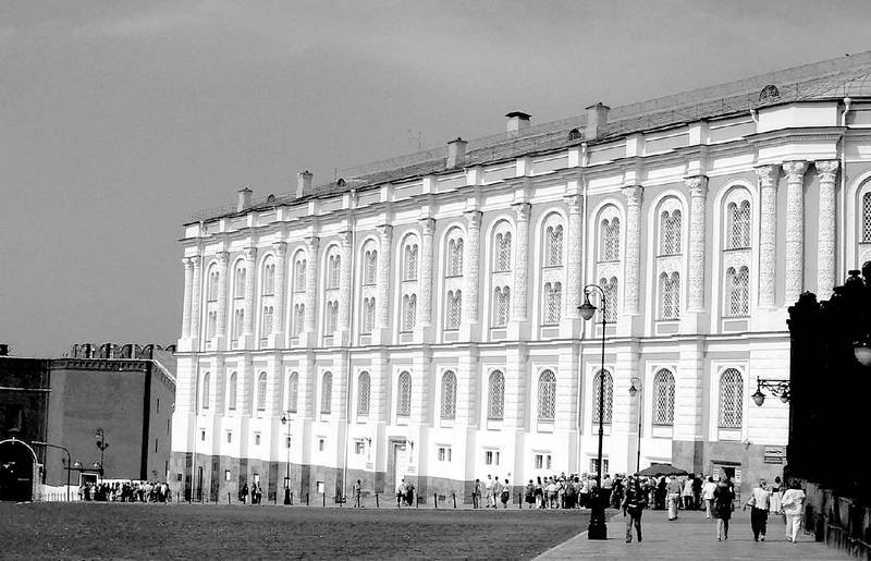 В 1838 г. началось возведение Большого Кремлевского дворца, продолжавшееся 10 лет: на бровке кремлевского холма выросло огромное монолитное здание, закрывшее собой живописный объем Теремного дворца, дворцовые церкви и собор Спаса на Бору, а из старинных зданий лишь Грановитая палата и Красное крыльцо по-прежнему выходили на Соборную площадь. Ящикоподобный, монотонный объем нового дворца заменил собой живописную группу разных строений, существовавших на этом месте с XVI в. Рядом с ним с 1844 по 1851 г. на месте Конюшенного двора строилось здание Оружейной палаты, близкой дворцу по отделке и масштабу, с такой же монотонной обработкой фасадов, где особенно непригляден цокольный этаж. Соединяет оба этих строения здание апартаментов.