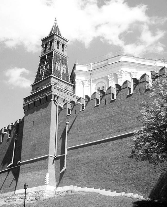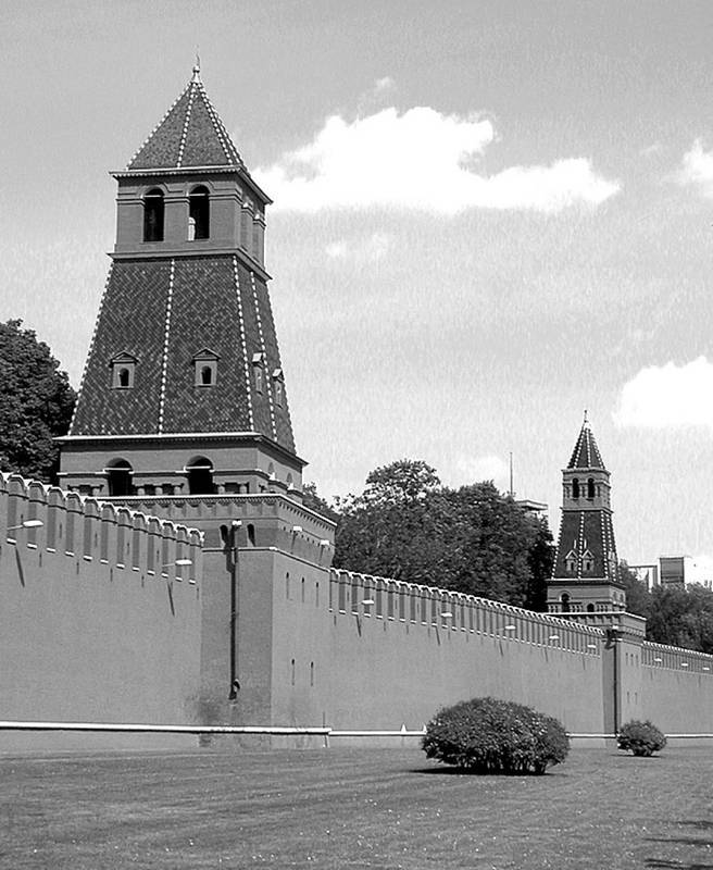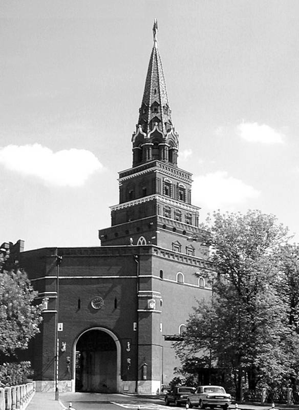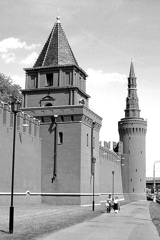 Изящная, даже грациозная, если это слово применимо к грозным крепостным сооружениям, Водовзводная башня отмечает резкий поворот Кремлевской стены к северу от слияния Москвы-реки и Неглинной. Современные формы башня получила не так уж и давно – в начале XIX столетия. Построенная в 1488 г. Антоном-фрязином, она много раз изменялась. Сначала, как и все другие кремлевские башни, Водовзводная не имела надстройки, которая была сделана позднее, в конце XVII в.; в 1805 г. ее вообще разобрали из-за ветхости и выстроили заново, а через семь лет взорвали отступающие наполеоновские войска. Пришлось опять возводить ее – в 1819 г., и она, единственная из кремлевских башен, была обработана тогда классическими деталями – портиками, рустом, колонками.