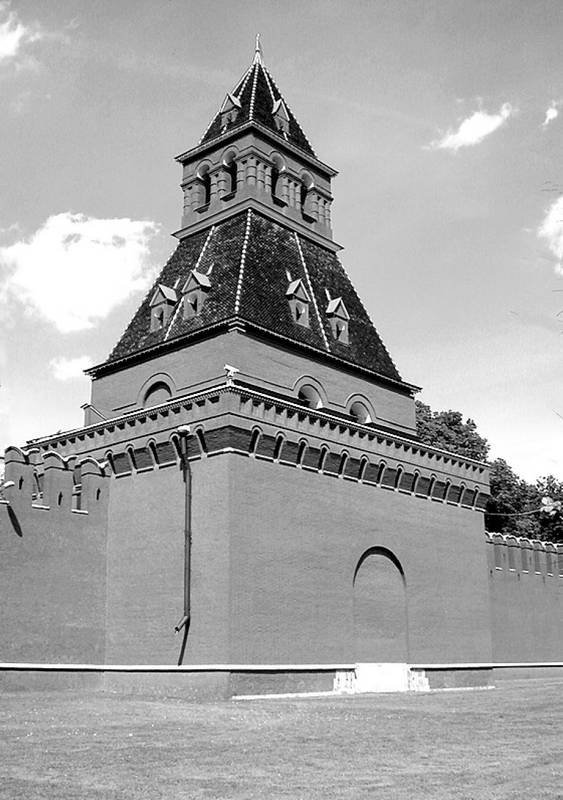 При попытке построить в Кремле огромный дворец Баженов в 1770 г. сломал башню, но вскоре пришлось воссоздать ее заново – в 1783 г., но без отводной стрельницы, которую восстановили в 1862 г. в древнерусских формах по проекту архитектора П.С. Кампиони. На плоской платформе башни поставили пушки для салютов.