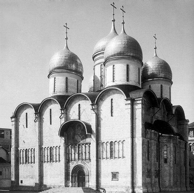 Окончен Успенский собор был через год после закладки. Это был небольшой храм с обычными трехчастными апсидами и двумя приделами, из которых южный был посвящен, возможно, святому Дмитрию Солунскому, а второй – Поклонению веригам апостола Петра, в память митрополита Петра. В 1459 г. пристроен еще один придел – Похвалы Богородицы, в благодарность чудесному спасению Москвы от нашествия ордынского хана Седи-Ахмета. Собор простоял почти полтора столетия и за это время сильно обветшал: как написал летописец, его «уже деревии толстыми комары подпираху», то есть бревнами толстыми своды подпирали. После большого пожара 1470 г. собор, конечно, еще более пострадал: «Того же лета, месяца августа в 1 день, исходящу второму часу, загореся Москва внутри города на подоле, близ Костянтина и Елены, от Богданова двора Носова, а до вечерни и выгорел весь…»