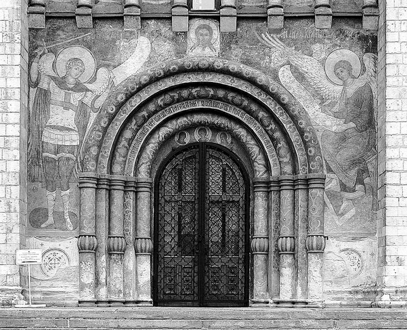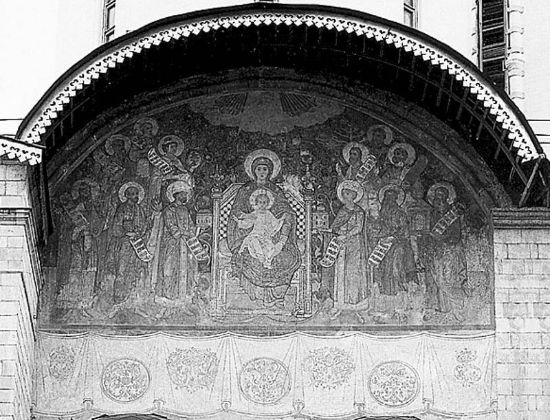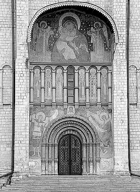 Слева от царских врат находилась самая известная икона собора – Владимирской Богоматери, написанная в Византии в XII в., которая теперь хранится в Третьяковской галерее, а на ее месте поставлена икона 1514 г. Слева от врат обращают на себя внимание фрески каменной алтарной преграды, на которых изображены монахи и отшельники. Эти фрески написаны после возведения собора и с тех пор не подвергались поновлению.