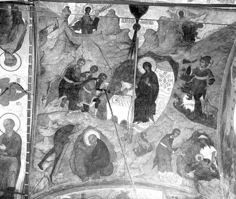 С восточной стороны росписи находятся на самом верху, в полях закомар (комарой назывался свод здания), где изображены Троица, ангел, Богоматерь, Иоанн Предтеча и поклонение Марии с Младенцем.
