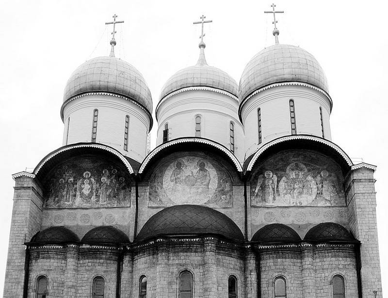 Фасад разделен на равные части и по высоте и по ширине, а обычные в русских церковных зданиях алтарные выступы сделаны небольшими, да еще скрытыми за выступами небольших стенок, что придало зданию монолитность – «яко един камень», отметил летописец. По горизонтали здание разделено декоративным поясом колонок и арочек, а по вертикали – пилястрами на равные промежутки с узкими и высокими окнами. В здание ведут три входа – северный и южный (они, как правило, закрыты) и западный, через который и входят в храм. Южный, со стороны Соборной площади, был парадным, открывался только в случае торжественной церемонии. Он оформлен белокаменным арочным порталом, над которым находится фреска, изображающая Богоматерь с двумя архангелами по сторонам – Михаилом и Гавриилом; ниже, между колонками, изображены святители, а по сторонам от входа – фигуры ангела (справа) и еще одного архангела Михаила (слева) с мечом, грозящим не кому-либо, а посетителям, как было написано, «разглагольствующим в церкви», – надо было, оказывается, прибегать к таким угрозам непочтительным москвичам.