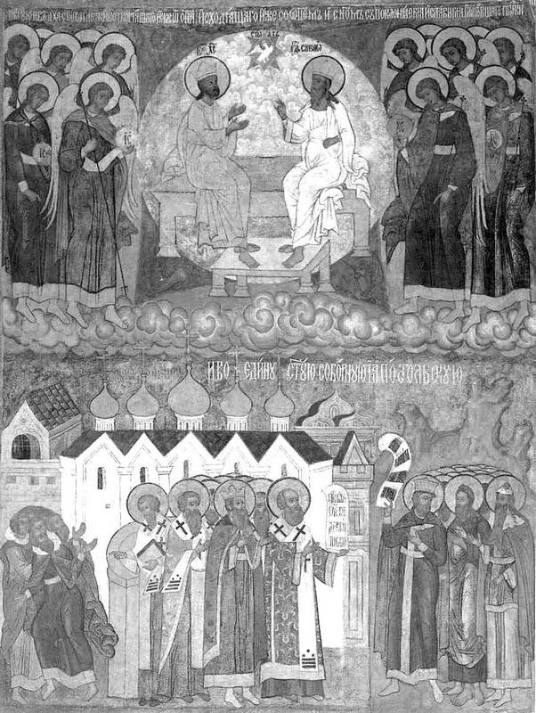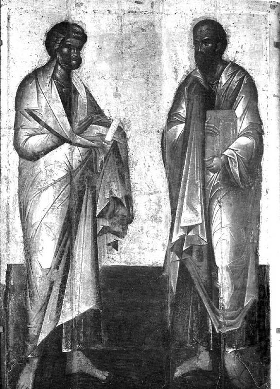 Великолепные иконы находятся у стен – южной и северной. У южной – Петр и Павел (вторая справа), возможно принадлежащая кисти Феофана Грека, и иконы Дионисия и его школы: Апокалипсис, Митрополит Петр с житием, О тебе радуется (третья, четвертая и пятая справа). У северной стены самая древняя икона – Святой Николай начала XV в. (крайняя слева), далее иконы XVI–XVII вв.: Преподобный Александр Свирский (1547), Боголюбская Богоматерь с житием Зосимы и Савватия, соловецких чудотворцев (1545), Тихвинская Богоматерь (1668) со 103 клеймами – рассказами о ее жизни, Сошествие во ад из Соловецкого монастыря (XVI в.), Достойно есть (середина XVI в.), Успение (1668). А у самого иконостаса висит любопытная икона, изображающая Троицу, работы известного иконописца Тихона Филатьева XVII столетия. Реставраторы расчистили лицо ангела справа, и тогда появилась живопись XIV в.