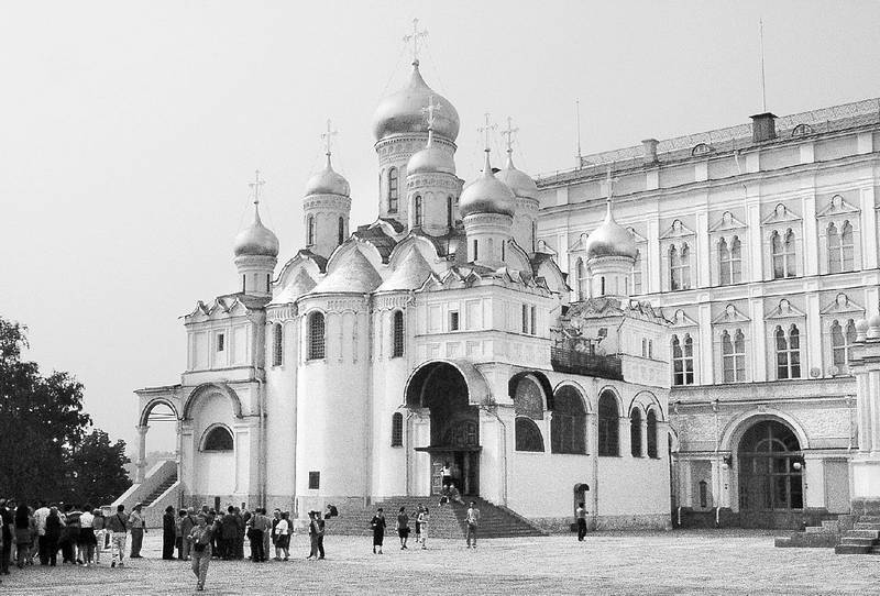 Новый храм был закончен в 1489 г. и освящен 9 августа митрополитом Геронтием. Церковь была, как и предыдущие, домовым храмом – «на великого князя дворе», соединявшимся с дворцом переходом, откуда можно было пройти в собор по узкой и крутой лестнице (ее ступени видны за решеткой на северной стене, слева от иконостаса). Эта постройка составляет центральную часть существующего здания – с тремя апсидами и окружающей храм галереей и тремя главами (позже добавили еще две главы). Через 80 лет, при Иване Грозном, после пожара 1547 г. над углами обходившей храм галереи поставили четыре небольших придела, или так называемые церковицы (называется и другая дата – 1563–1566 гг.), которые освятили в честь Входа Иисуса Христа в Иерусалим, архангела Гавриила, собора Пресвятой Богородицы и святого Георгия, переосвященный в царствование Александра I в честь Александра Невского; там, в иконостасе, поместили образа святых, тезоименитых лицам царствующего дома Романовых.