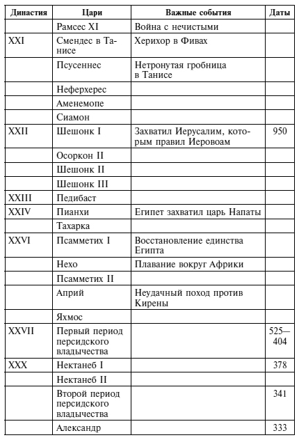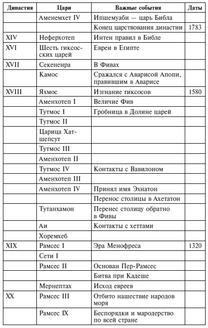 Проверить, насколько вкусен пудинг, можно, только съев его. Так и в точности предлагаемого метода датировки можно удостовериться, если благодаря ему удастся точно определить даты событий из истории Египта и даже соседних стран, происходивших в период Нового царства и позднее. Исследователи больше не могут вычитать некое количество лет из времени правления одного царя и добавлять их к царствованию другого. Если изменить приведенную ниже хронологическую таблицу, она не будет соответствовать тому, что нам известно о Древнем Востоке. Ниже приведены имена царей, которые впоследствии будут упомянуты в данной книге, а также даты их правления.