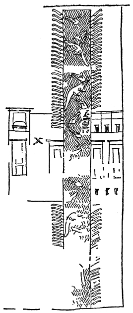 Рис. 3. Кишащее крокодилами озеро на Суэцком перешейке. Озеро служило границей между Египтом и пустыней, населенной кочевниками. Рельеф из Карнака