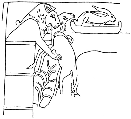 Рис. 7. Лев, вытаскивающий газель из-за ограды. В гробнице Птахотепа, сооруженной в тот же период, изображены охотники с пойманными ими львом и пантерой. Гробница Ти