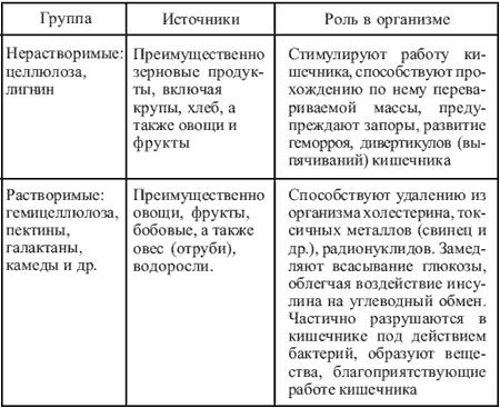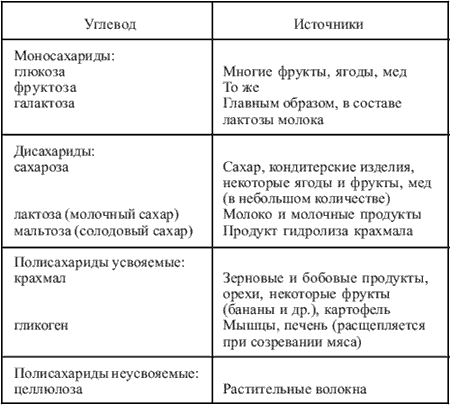 Углеводы представляют собой сахара: простейшие, состоящие из одной молекулы, называются моносахаридами, дисахариды, соответственно, состоят из двух молекул Сахаров, и полисахариды состоят из большого числа молекул. Кроме того, углеводы делятся на усвояемые и неусвояемые (неусвояемые – те, которые не могут быть расщеплены пищеварительными соками человека). Более наглядно информация об углеводах представлена в следующей таблице.