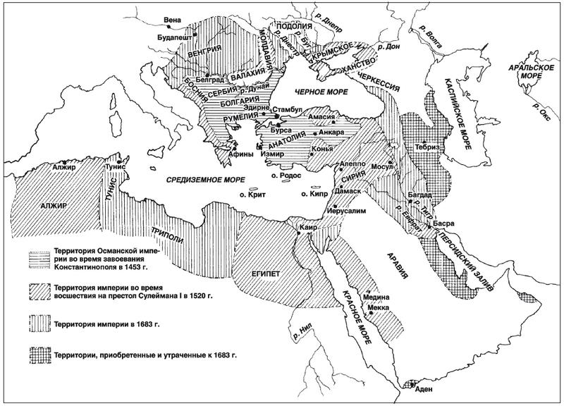 В зените могущества империи ее владения простирались от Будапешта на Дунае до Асуана на Ниле и от Евфрата почти до Гибралтара. В Европе Турецкая империя включала Балканский полуостров, Трансильванию, Молдавию, Валахию, большую часть Венгрии, Подолию, все северное побережье Черного моря, Крит, Кипр и острова Эгейского моря; в Азии – Малую Азию, Армению, большую часть Кавказа, долины Тигра и Евфрата, Персидский залив, все Восточное Средиземноморье и полосу побережья Аравийского полуострова до залива Адена; в Африке – Египет, Триполи, Тунис и Алжир. Население империи насчитывало около 50 миллионов человек. Оно состояло из мусульман: турок, татар, арабов, курдов, туркмен, берберов и черкесов. Определенное число боснийцев, албанцев и болгар было обращено в мусульманскую веру. Христианское население придерживалось в основном православного вероисповедания. Оно включало греков, венгров, сербов, румын, армян, грузин и египетских коптов. Были также евреи и, кроме того, рабы из Германии, Польши, России, Греции, Италии, Франции и Испании.