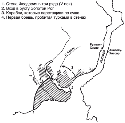 Город был обнесен тремя рядами стен со рвами между ними, заполненными водой, на стенах находились сторожевые башни, существовали широкие проходы для передвижения войск. Городские стены выдержали двадцать осад, но теперь войска были способны преодолеть их прочность. Вход в бухту Золотой Рог перегораживала большая цепь, протянувшаяся от берега к берегу. Ловким ходом Мехмета стала постройка деревянного настила, смазанного маслом, который тянулся от берега Босфора до речки, впадавшей в Золотой Рог. По настилу при помощи быков перетащили 70–80 турецких кораблей. Они прошли по речке в бухту, оказавшись по другую сторону от перегораживавшей ее цепи. Население Константинополя проснулось в пост на понедельник в 1453 году, чтобы увидеть жуткое зрелище передвижений вражеского флота уже у стен города.