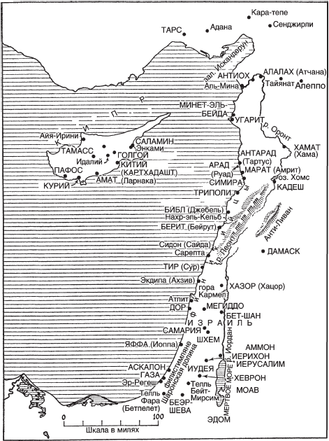 Сирийско-Палестинское, или, как мы для краткости будем называть его, Левантийское, побережье протянулось примерно на 450 миль от залива Искандерун до египетской границы (рис. 1). Финикийские города располагались в средней части этой полосы длиной около 200 миль от Антарада (Тартуса) на севере до Дора или, возможно, до Иоппы (Яффы) на юге[3].