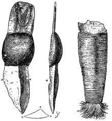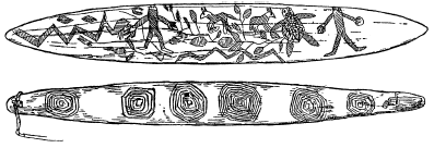 Вдруг покой нарушает тихий, вибрирующий звук десятка, а то и более бол-рорэ[2]. Некоторые из них имеют весьма внушительные размеры – примерно восемнадцать дюймов в длину, четыре дюйма в ширину, широкие в середине и сужающиеся к обоим концам, как сигара. Длина других составляет всего шесть дюймов. Громкость их звука варьируется. Иногда она достигает силы звука сильного ветра, а затем постепенно снижается до стона, напоминающего вздох сожаления. Это представление продолжается до следующего восхода солнца. За этим следует еще один перерыв, во время которого племена завтракают. Такие церемонии продолжаются шесть или более недель, а весь процесс посвящения и церемониальных торжеств длится несколько лет.