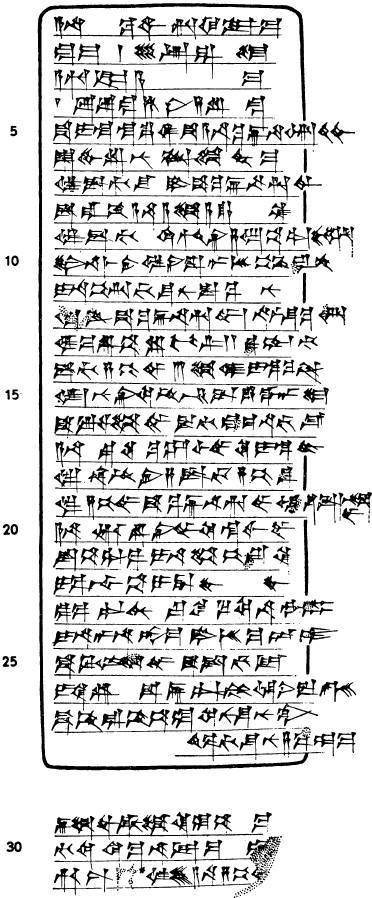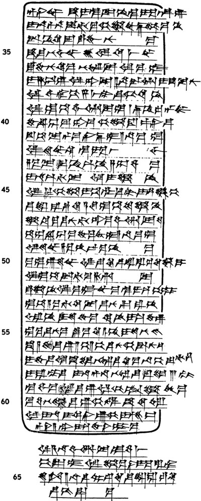 Вторым важным требованием, предъявляемым к исследователю, имеющему дело с клинописным текстом, является понимание написанного в источнике. Большинство ассириологов, сталкивающихся с необходимостью редактирования клинописных текстов, начинает, как я полагаю, с прочтения написанного на табличке и транскрибирования текста, в результате чего у них формируется приблизительное представление о его значении. Затем, когда достигается понимание смысла надписи, ее копируют. При этом крайне важно передать текст в том же виде, в каком он был записан изначально. Для этого используется особый вид туши, благодаря которому сделанная копия не отличается от оригинала. Именно в таком виде текст предстает перед глазами ученых. Иногда делается несколько снимков: фотографируется вид таблички спереди и сзади, сверху и снизу, справа и слева. Порой конец строки (на табличках писали слева направо) выходит за пределы предназначенного для написания текста пространства, переплетаясь таким образом с текстом, выдавленным на другой стороне. Аналогичным образом использовались и три оставшиеся боковые грани таблички. На рис. 1 и 2 помещен скопированный мной текст таблички, фото 15 дает представление о том, как она выглядит (на ней виден тот же текст, что и на рис. 1).