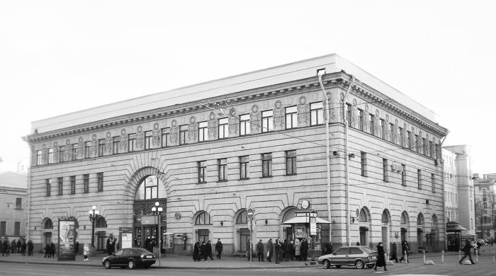 * * *Наземный вестибюль «Пушкинской» разрабатывался, когда работа над проектом подземного станционного зала уже завершилась и его рекомендовали к осуществлению. Авторы включили вестибюль в трехэтажное классическое здание, стоявшее по соседству с Витебским вокзалом и построенное в 1901 г. по проекту архитектора А.К. Зверева для размещения офицерских казарм лейб-гвардии Семеновского полка. До революции дом занимали Правление Царскосельской железной дороги и Правление Петербургской сети Московско-Виндаво-Рыбинской железной дороги. В 1930-х гг. здание надстроили четвертым этажом, а в начале 1950-х гг. существенно перестроили под станцию метрополитена. Вестибюль богато украсили лепниной, окна первого этажа получили арочные проемы, а в центре фасада появилась большая арка. Один из вариантов проекта предусматривал соединение павильона метро и вокзала пропилеями.