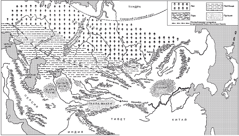 Настоящая степь – это пастбище без деревьев, травянистая равнина между горами, не приспособленная для земледелия, если только не устроено дорогостоящее орошение, но прекрасно подходящая для скотоводства. На пастбищах растет отличная трава. Почва варьируется от каменистой до соляной и суглинков. Климат хотя и суровый и в высокогорьях зимой очень холодно (на Алтае температура ниже нуля бывает до 200 дней в году), чрезвычайно сухой и потому легко переносится, а здешние пастухи славятся своим долголетием. Пастбища Монголии и Киргизии намного обширнее, однако сердцем степей всегда считались пастбища вдоль северных предгорий Тянь-Шаня и южных предгорий Алтая. Через низкие проходы между этими двумя горными цепями конные кочевники с дней скифов до эпохи монголов снова и снова проникали из Азии в Европу.