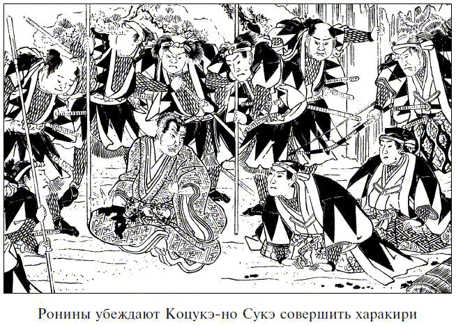 Ронины из уважения к высокому сану Коцукэ-но Сукэ обращались с ним с величайшей почтительностью и неоднократно настойчиво убеждали его совершить харакири. Но тот, сжавшись, молчал и трясся от страха.